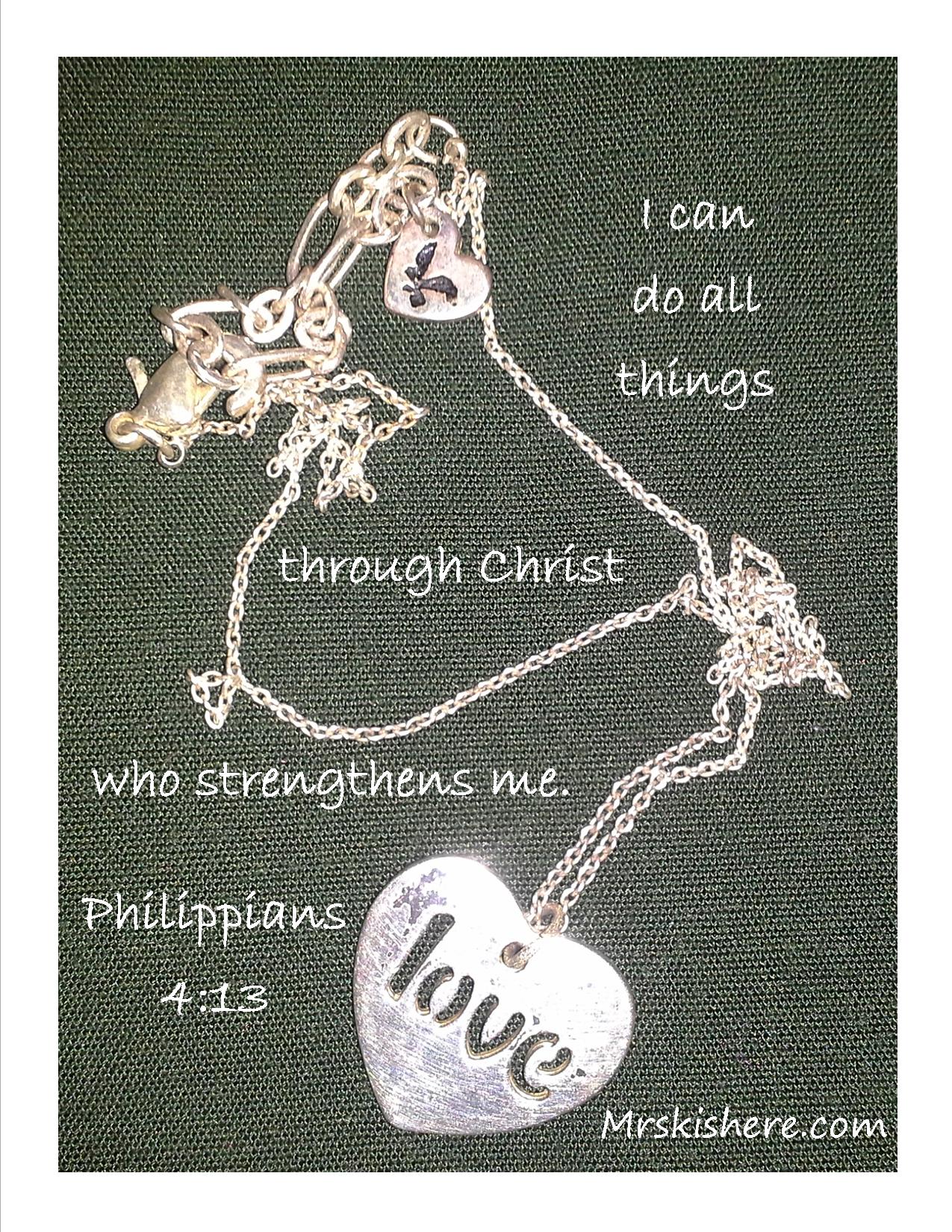 As always, the best encouragement comes from God’s word.  “He guides the humble in what is right and teaches them his way.” (Proverbs 25:9)  As a loving Father, God wants to strengthen my faith, but even more than that, He wants a dynamic relationship with me.  When I give Him the tangles of my life, He teaches me to trust Him to do what He can with all that I cannot.  And a trusting and loving relationship is even more beautiful than any untangled necklace.Necklace Phil  4:13